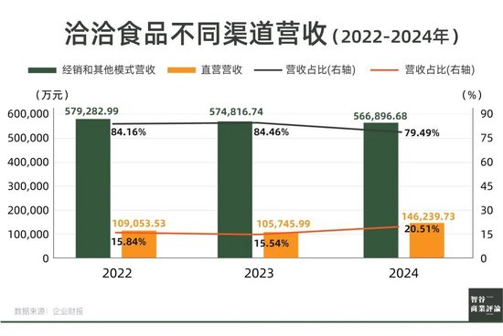 不过,最近几年,洽洽也逐渐加大了直营和线上的权重,2024年直营渠道的收入占比提升至了20.51%,经销和其他渠道的收入占比则收缩到了79.49%。