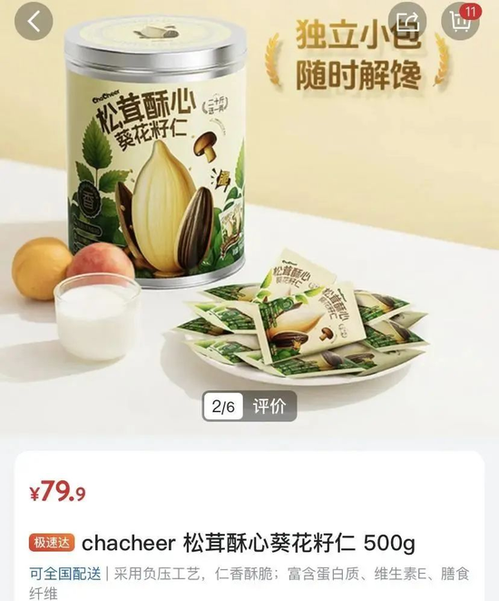 此外,山姆被爆上架了好丽友、卫龙、溜溜梅、盼盼等普通商品的同时,一些产品也通过“改头换面”从大众品牌变成“高端精选”,进驻了山姆。其中,一款黄白罐装、印着“chacheer”的瓜子,就是洽洽瓜子。