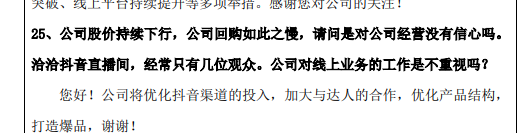 在五月份的投资者关系活动中,有投资人直接提问:“洽洽抖音直播间,经常只有几位观众。公司会线上业务的工作是不重视吗”?
