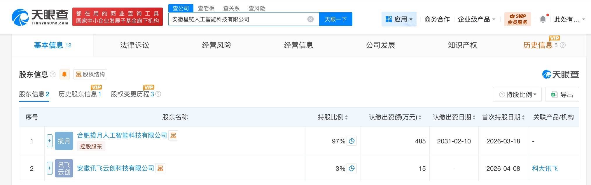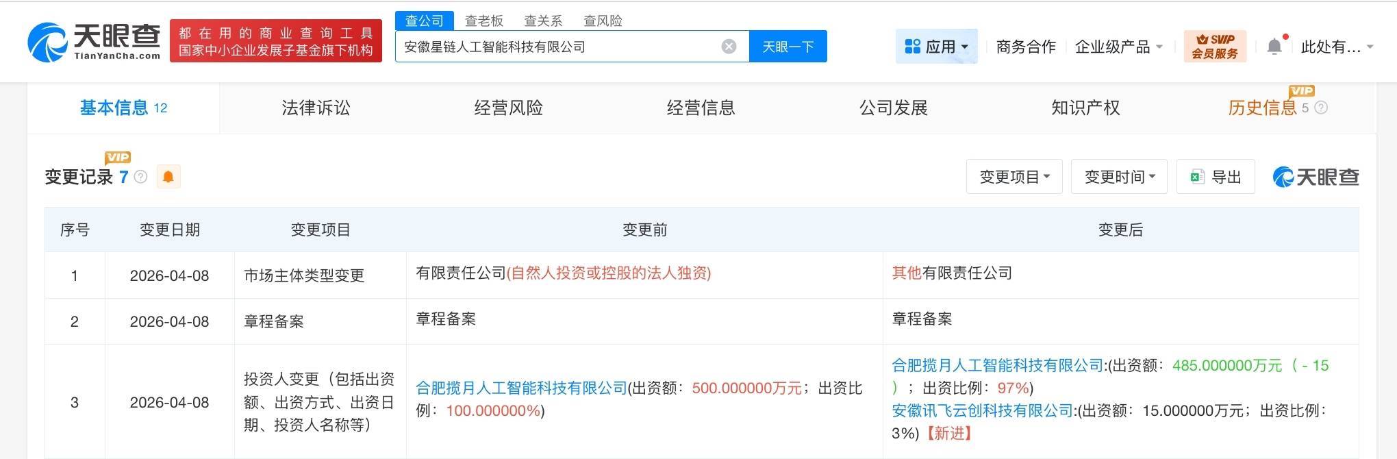 南方财经4月20日电,天眼查App显示,近日,安徽星链人工智能科技有限公司发生工商变更,新增科大讯飞旗下安徽讯飞云创科技有限公司为股东。安徽星链人工智能科技有限公司成立于今年2月,法定代表人为方家珍,注册资本500万人民币,经营范围含人工智能应用软件开发、人工智能基础软件开发、人工智能通用应用系统、人工智能硬件销售等。股东信息显示,该公司目前由合肥揽月人工智能科技有限公司、安徽讯飞云创科技有限公司分别持股97%、3%。