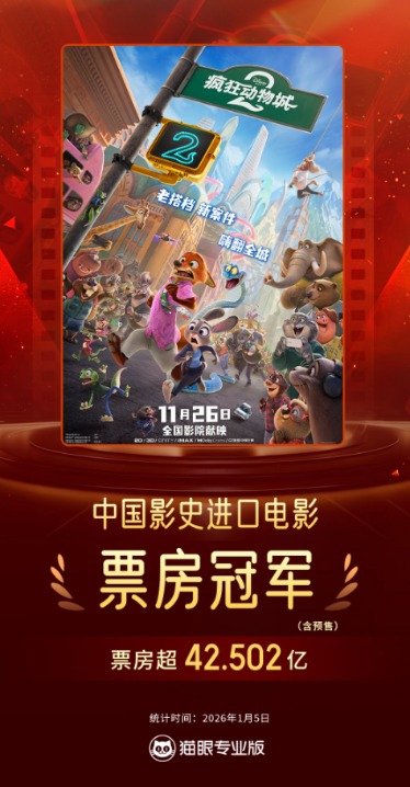 上证报中国证券网讯(记者杨翔菲)据猫眼专业版数据,截至1月5日晚间,电影《疯狂动物城2》累计票房(含预售)突破42.502亿元,超越《复仇者联盟4:终局之战》票房成绩,成为中国影史进口片票房冠军,进入中国影史电影票房榜前九名。